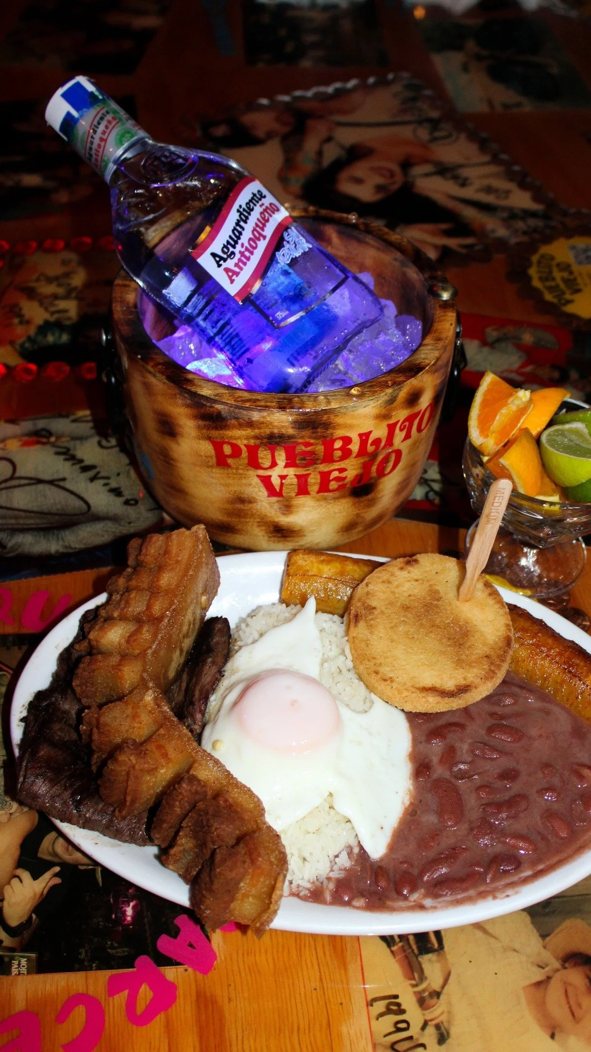 Red beans, rice, fried pork rinds, grilled or ground skirt steak, fried sweet plantains, fried egg and arepa.